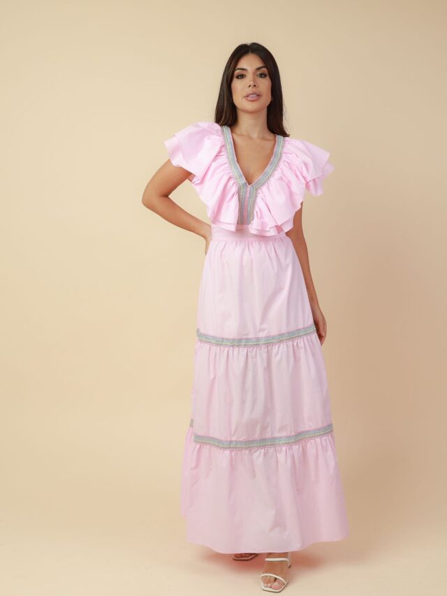 VESTIDO MIDI BABADOS ENTREMEIOS ROSA BEBÊ