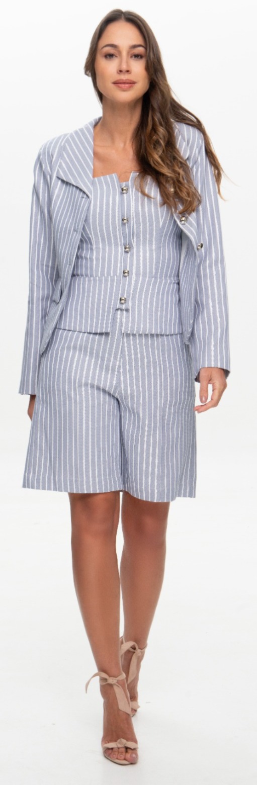 Com corte preciso e estampa de listras verticais, esse blazer une sofisticação e modernidade. A modelagem estruturada valoriza a silhueta, enquanto o padrão listrado traz leveza e alonga visualmente.