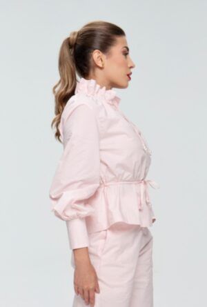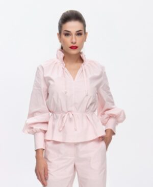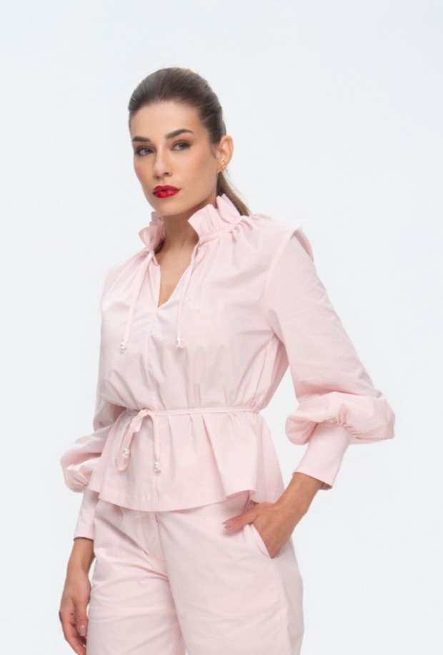 Essa blusa em tom rosa é confeccionada em tecido 100% algodão, com toque macio e caimento impecável. O diferencial está no decote franzido com amarração e ponteiras de pérola, que traz um ar romântico e moderno na medida certa.