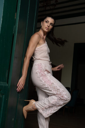 CALÇA JEANS SARJA ROSA BORDADA