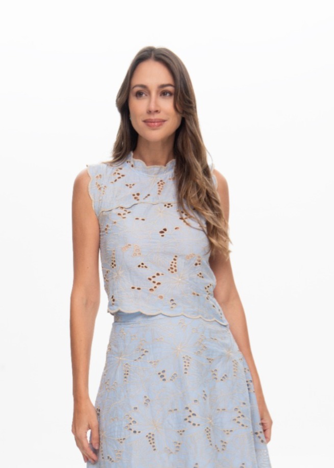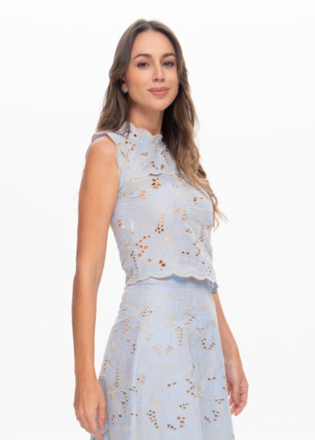 Feita em tecido bordado com desenho floral vazado, ela se destaca pelas delicadas pedrarias aplicadas ao longo do bordado, um toque de brilho sutil que valoriza ainda mais a peça. O acabamento recortado nas barras e gola traz um efeito artesanal e refinado, perfeito para compor looks mais elaborados com calça de alfaiataria, jeans ou até couro.