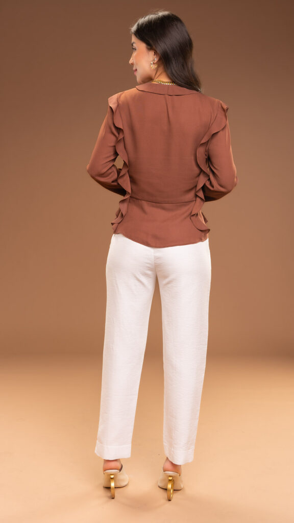 Confeccionada em tecido de alta qualidade, oferece conforto, leveza e um caimento impecável. O decote V com o charme dos babados valoriza o pescoço e o design moderno, enquanto o tom caqui adiciona um toque sofisticado ao visual.