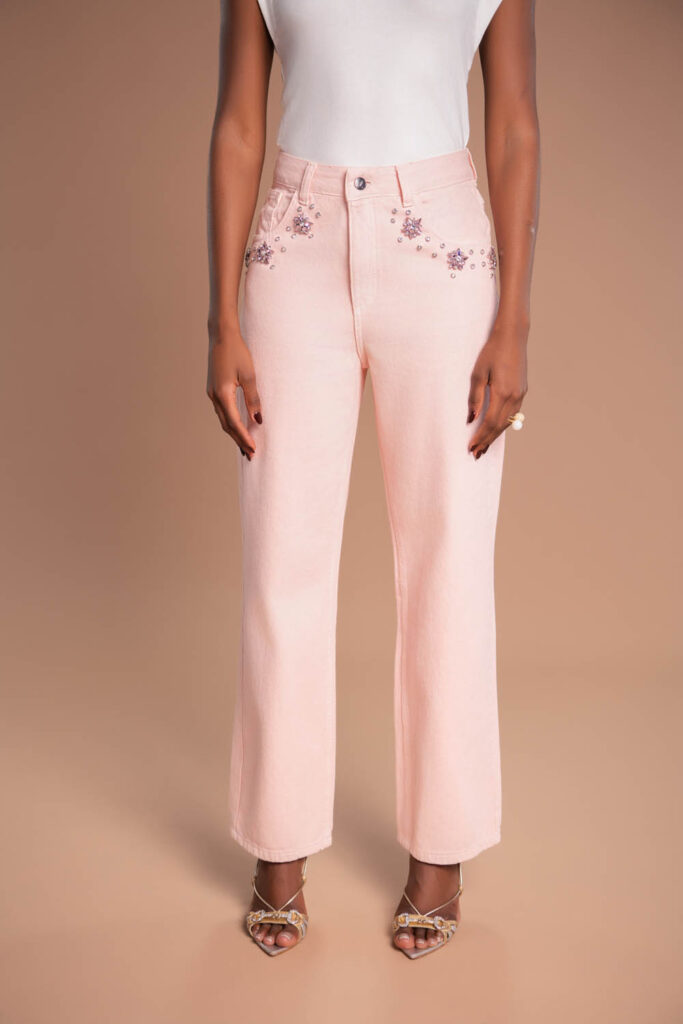 CALÇA JEANS SARJA ROSA BORDADA