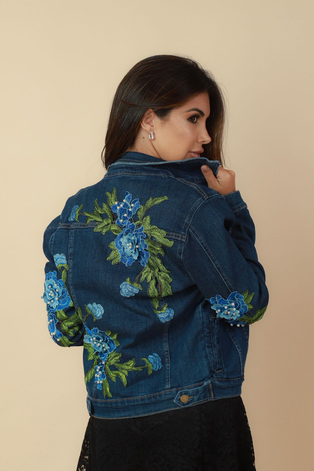 JAQUETA JEANS BORDADA ROSAS AZUIS
