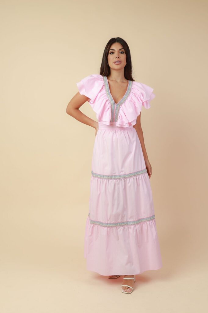 VESTIDO MIDI BABADOS ENTREMEIOS ROSA BEBÊ