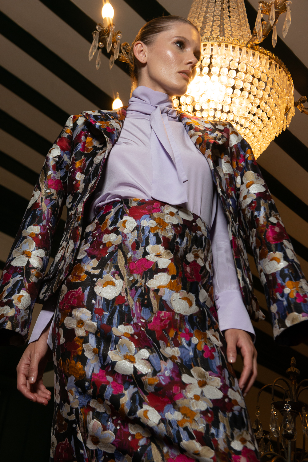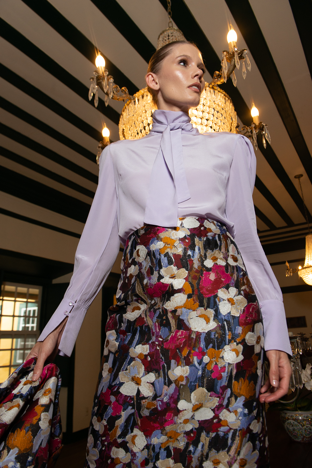 Tecido jacquard encorpado, estampa elegante,Cintura alta com ótimo ajuste ao corpo. Fechamento posterior com zíper invisível.