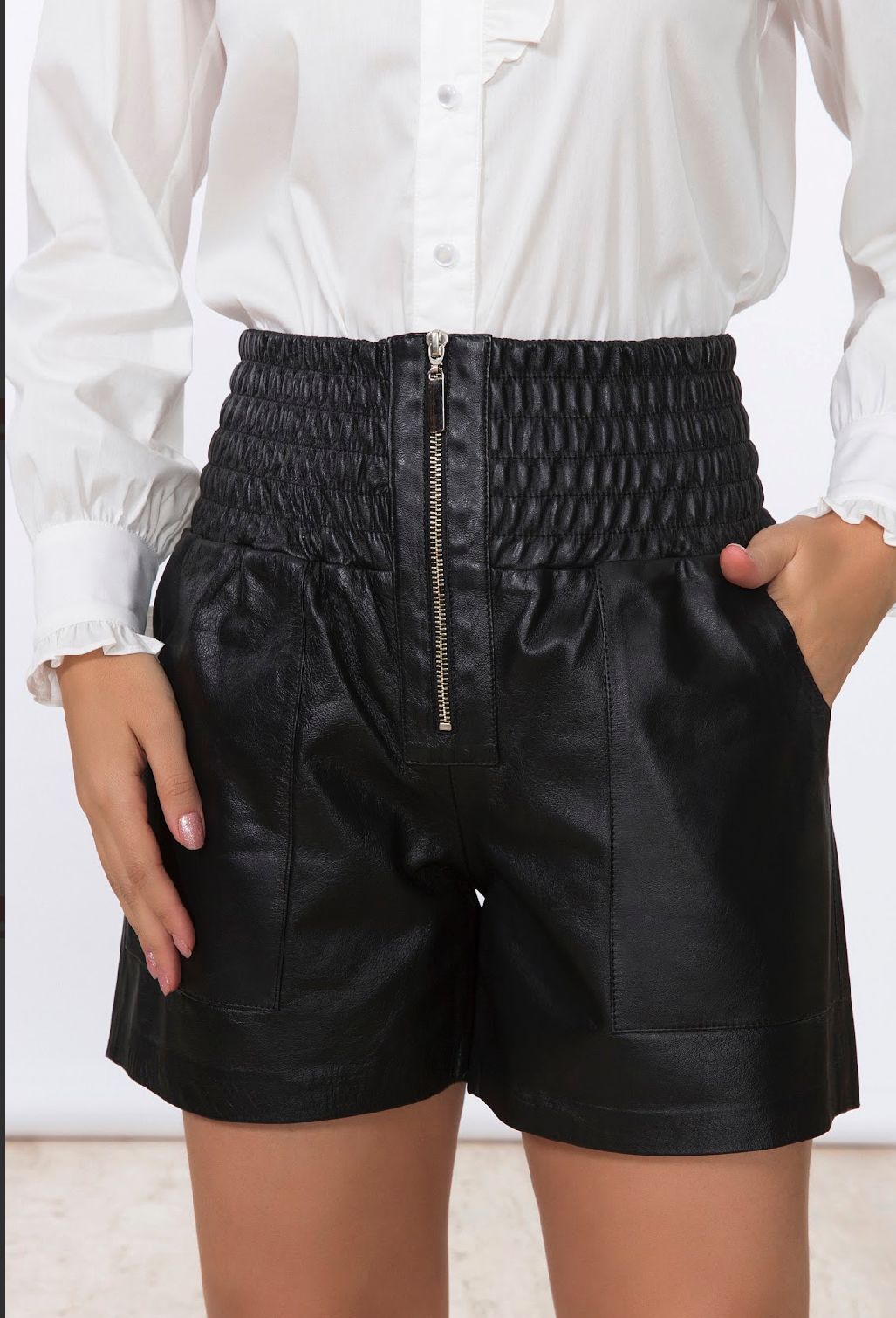 A peça possui cintura alta, cós com acabamento em lastex, bolsos frontais e fechamento por zíper.