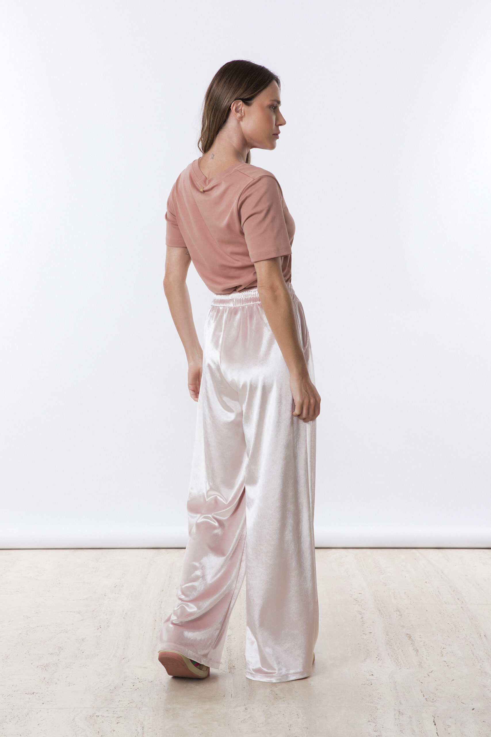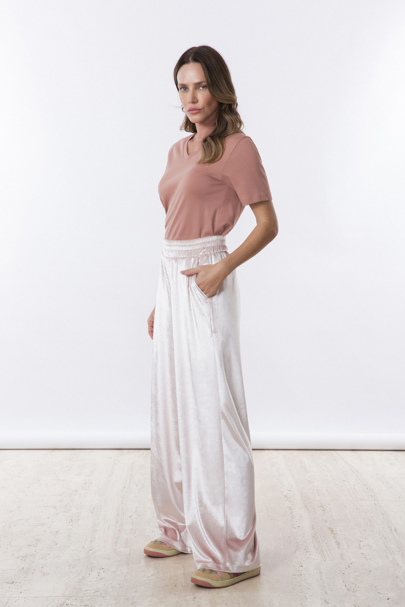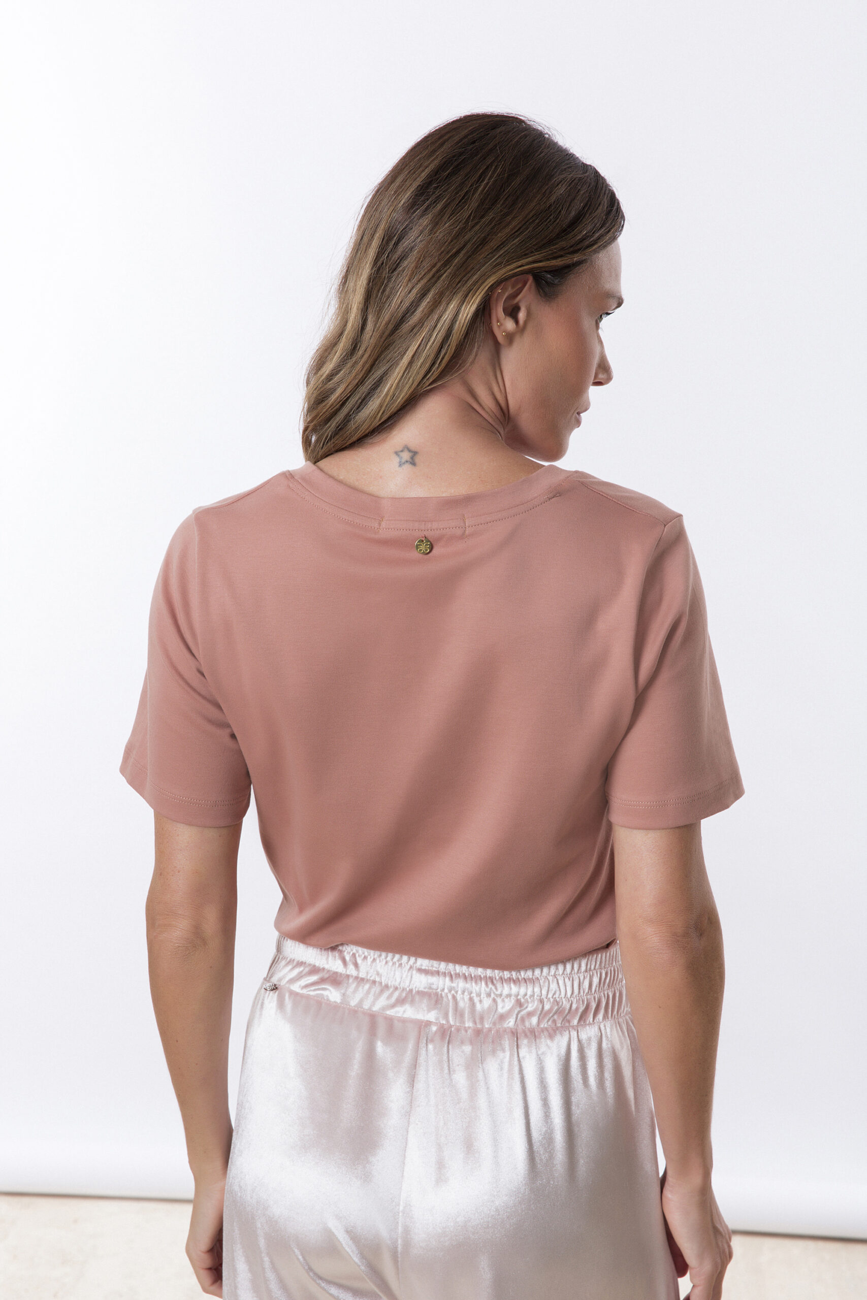 A T-shirt Lívia Decote V na cor mousse é uma peça básica, elegante e muito versátil.
