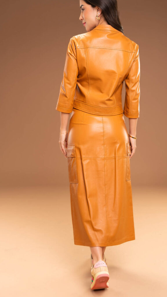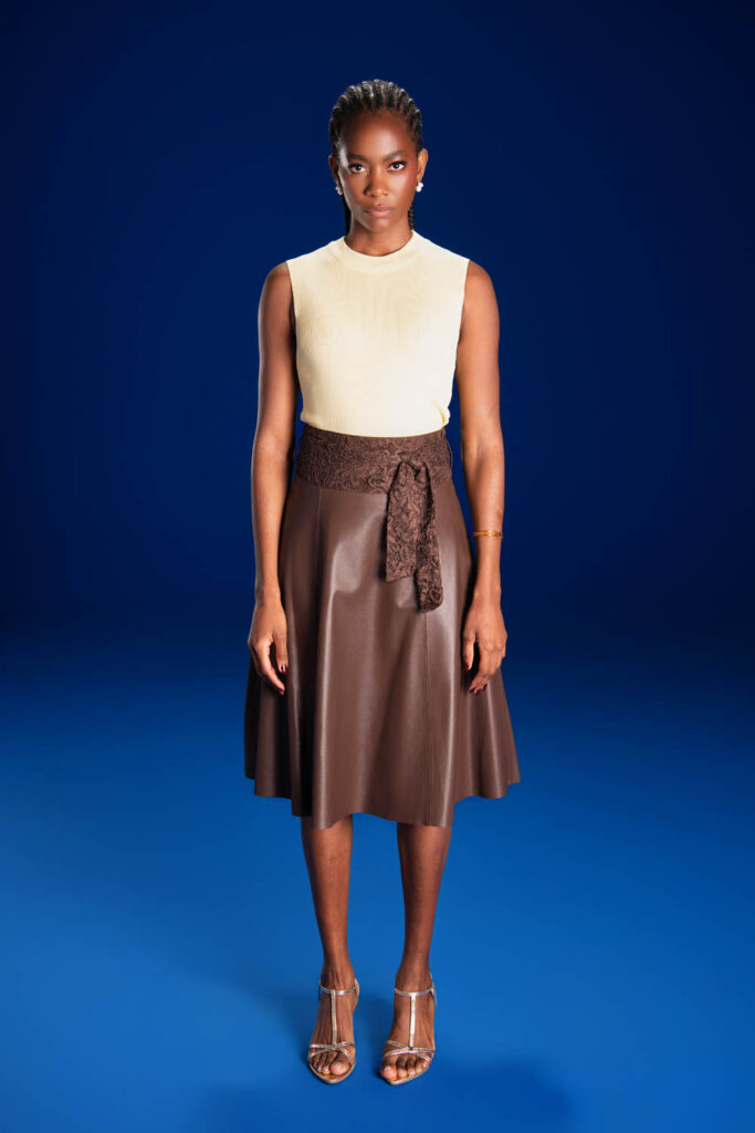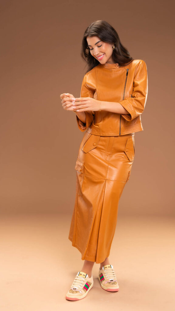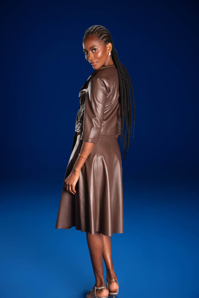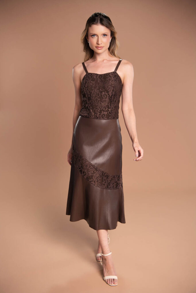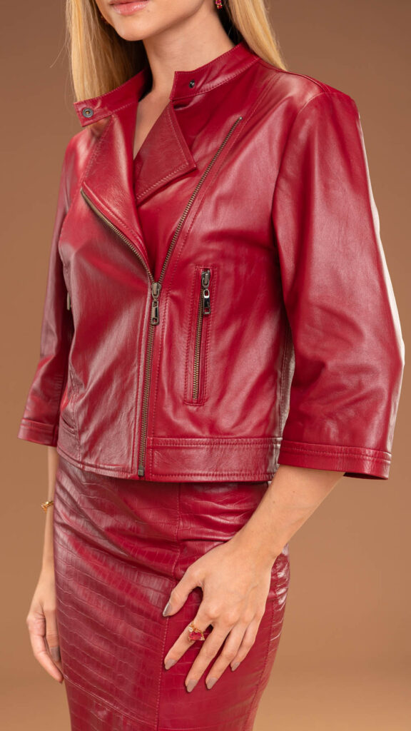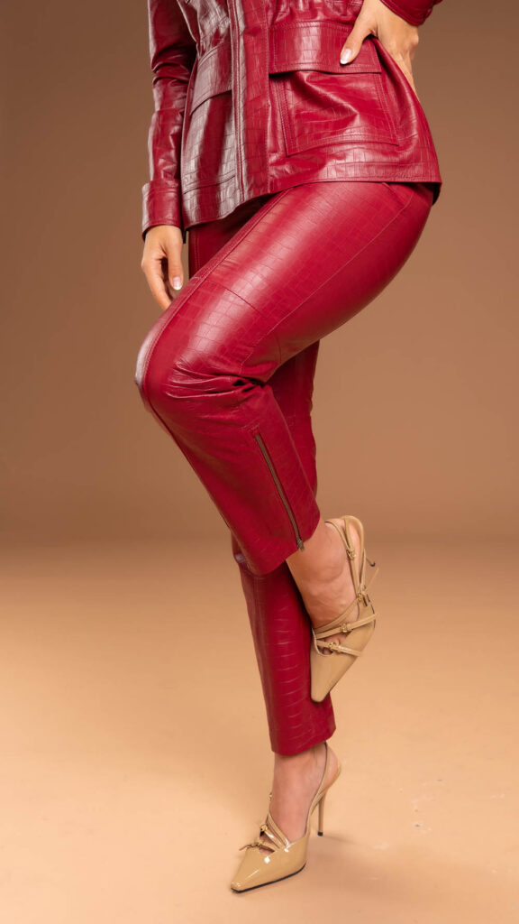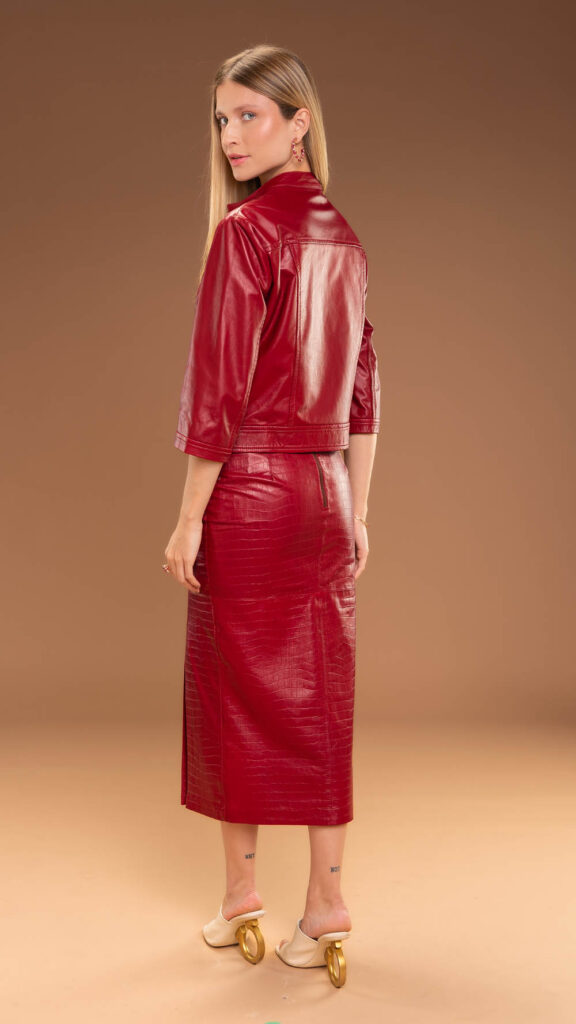 Esse vestido é uma peça ousada pela cor vermelha e sofisticada pelo seu artigo em couro, exala poder e elegância.