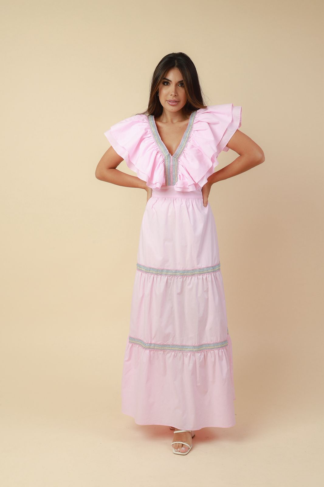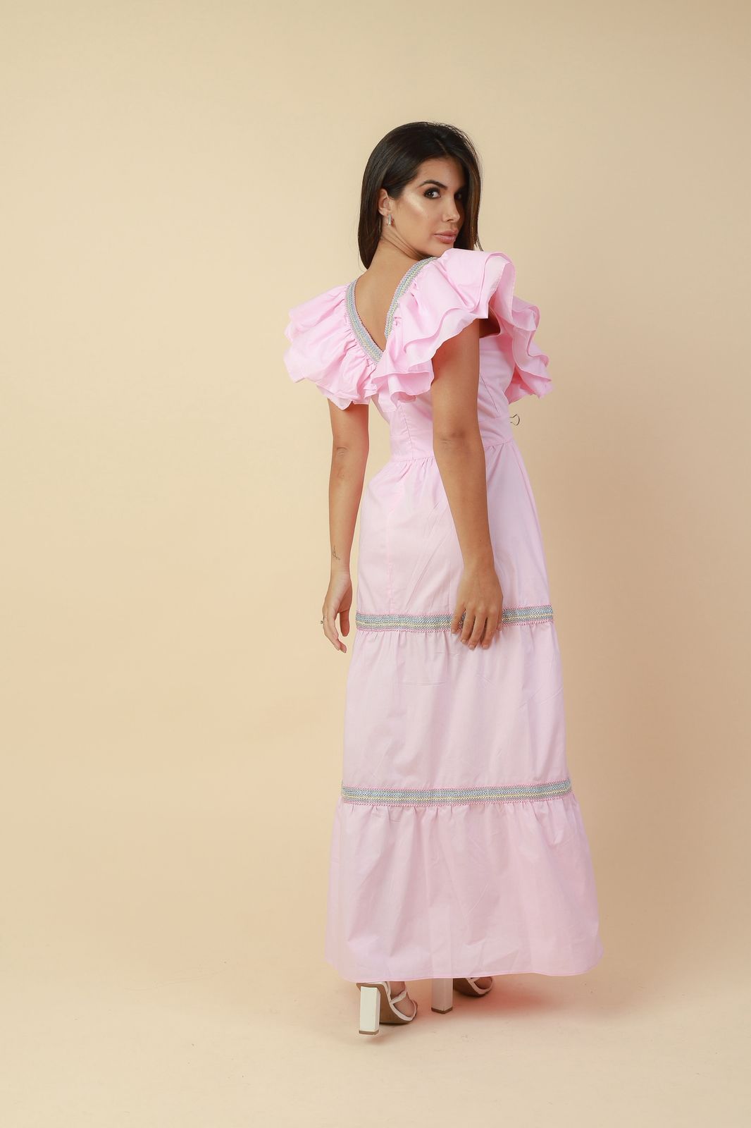 VESTIDO MIDI BABADOS ENTREMEIOS ROSA BEBÊ