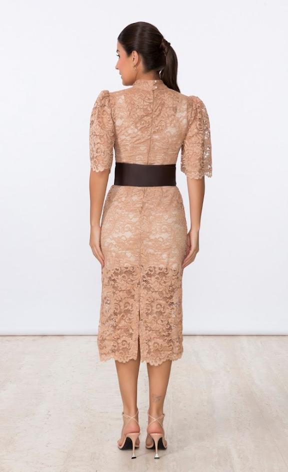 Ele é todo em renda bege, com um desenho delicado e acabamento rendado na barra, que dá aquele ar mais fino e feminino. O comprimento é midi (abaixo do joelho), o que deixa a peça clássica e ideal para eventos mais formais.
